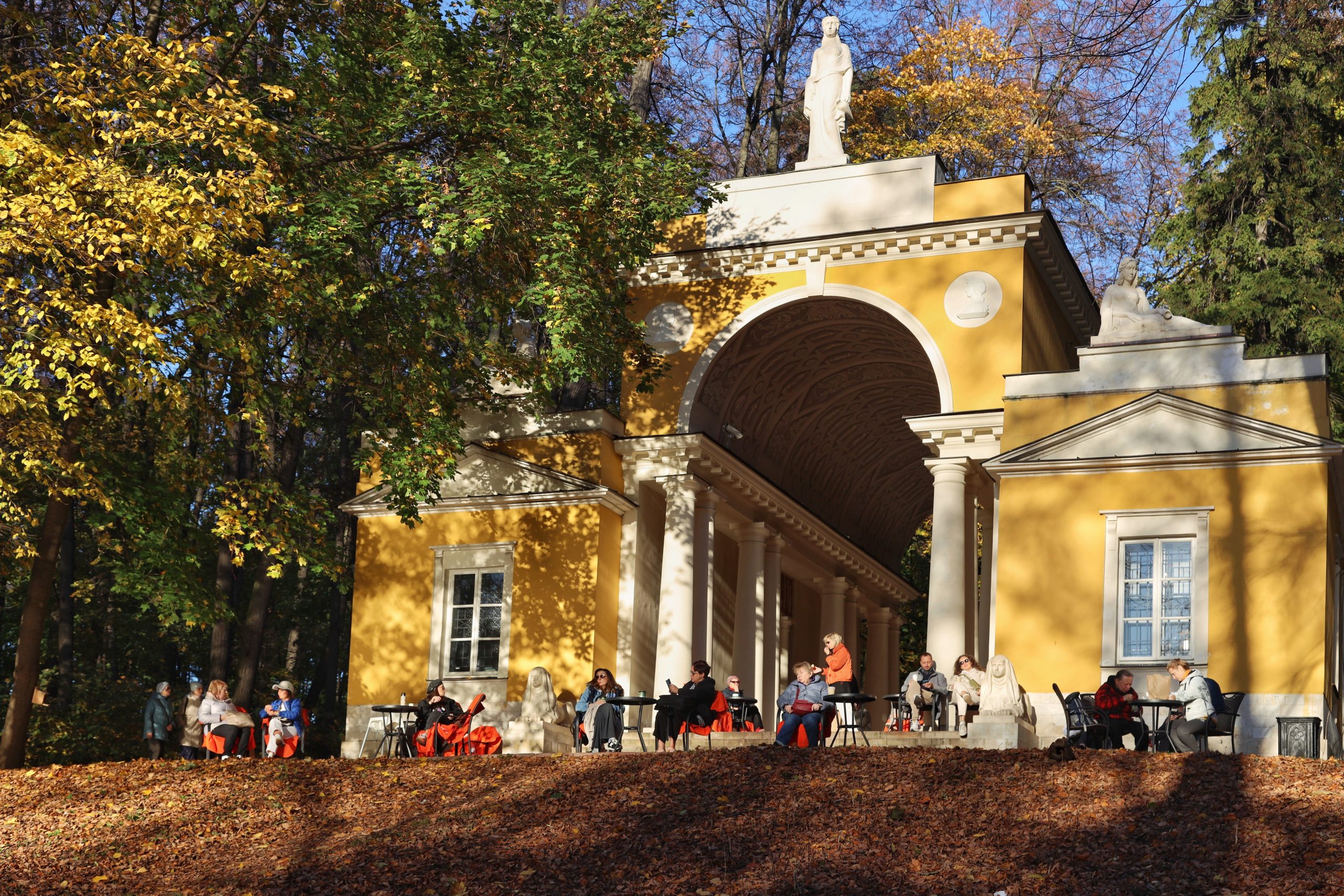 Особое внимание уделяется созданию уютной атмосферы в теплое время года с помощью зонтов, палаток и уличных огней. В холодный период — установка обогревающих приборов и уютных пледов.